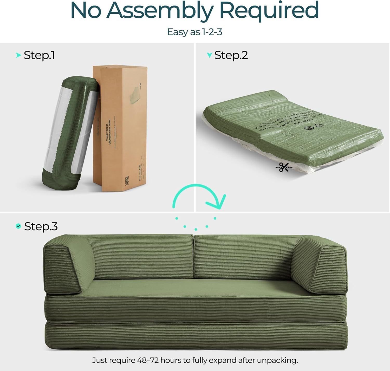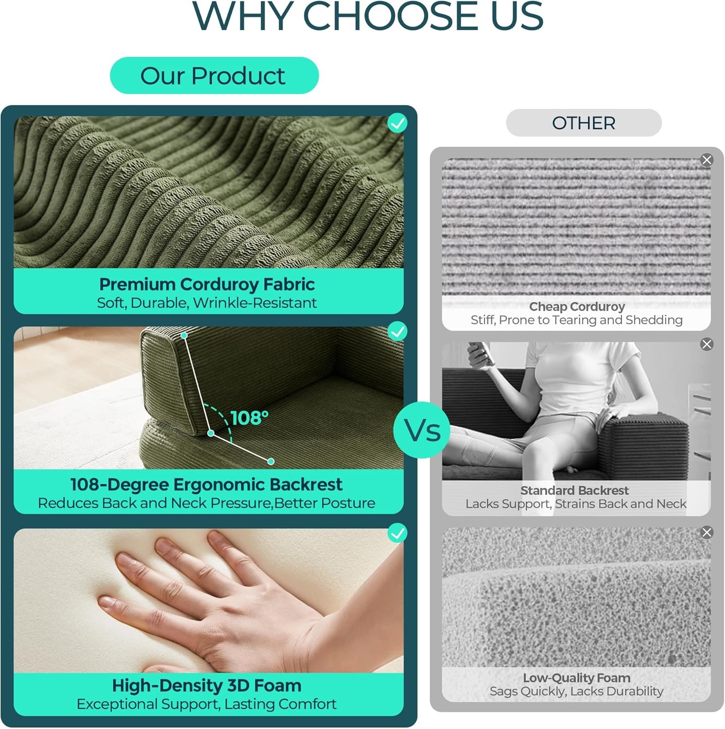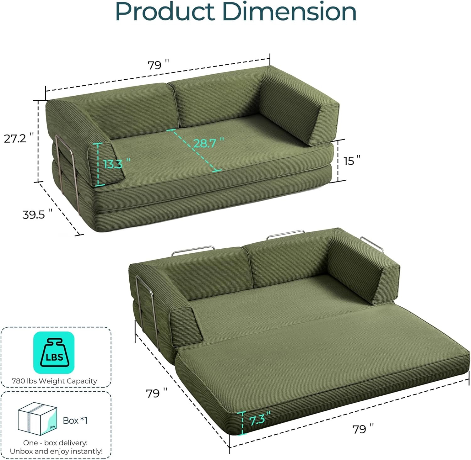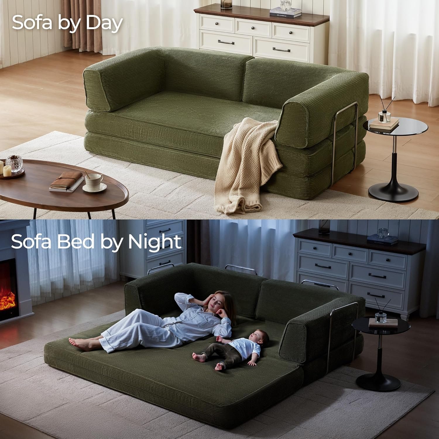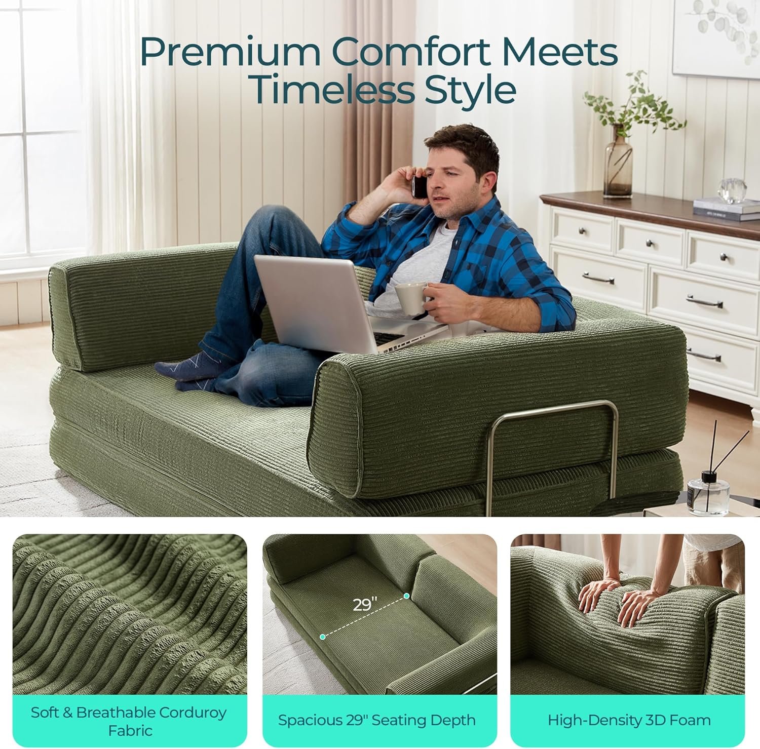 The LINSY HOME Convertible Sofa Bed blends comfort and versatility with plush corduroy upholstery and a solid wood + metal frame supporting up to 660 lb. With a quick pull-out transformation and hidden storage compartments, it adapts easily for guests or everyday lounging—click to view full specs.