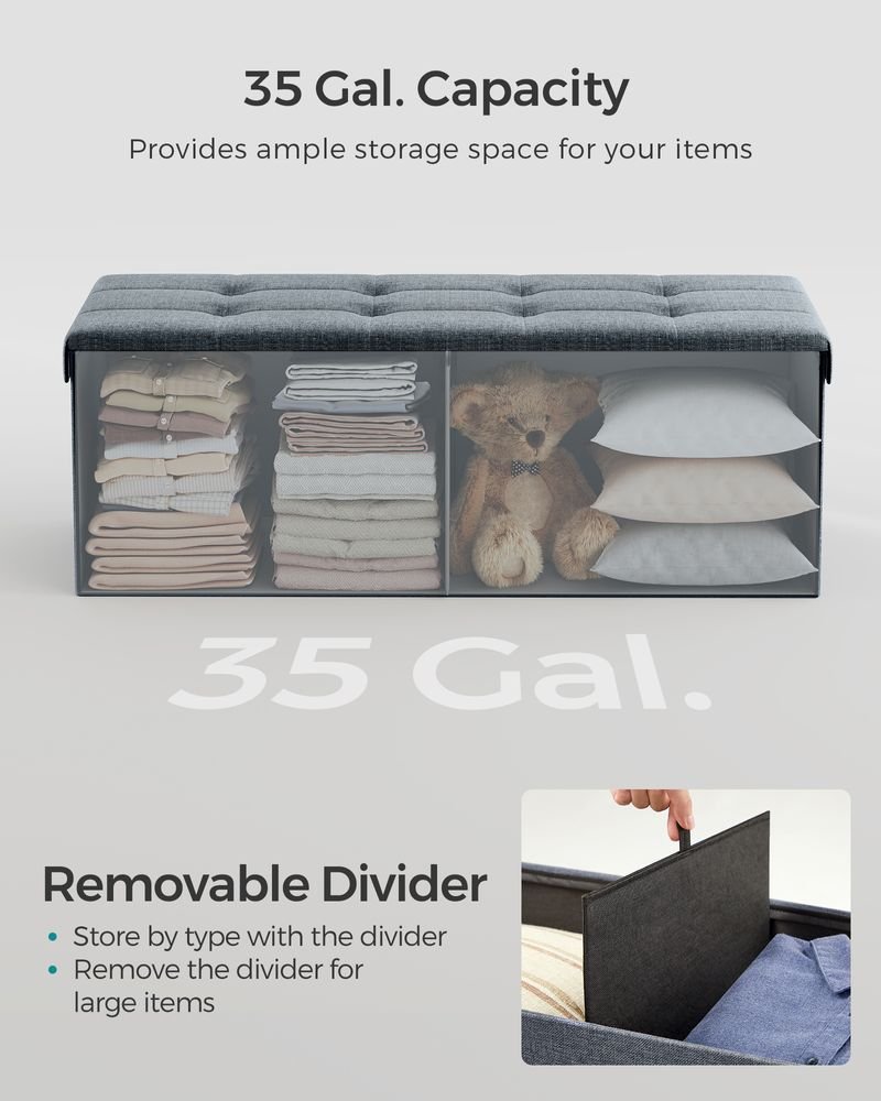 The SONGMICS 43″ Folding Storage Ottoman Bench offers a blend of sleek design and everyday utility, with durable MDF construction and corner reinforcements that support up to 660 lb. Its 131 L interior with divider keeps your space tidy, while the fold-flat design ensures compact storage when not in use. Discover more by clicking through.